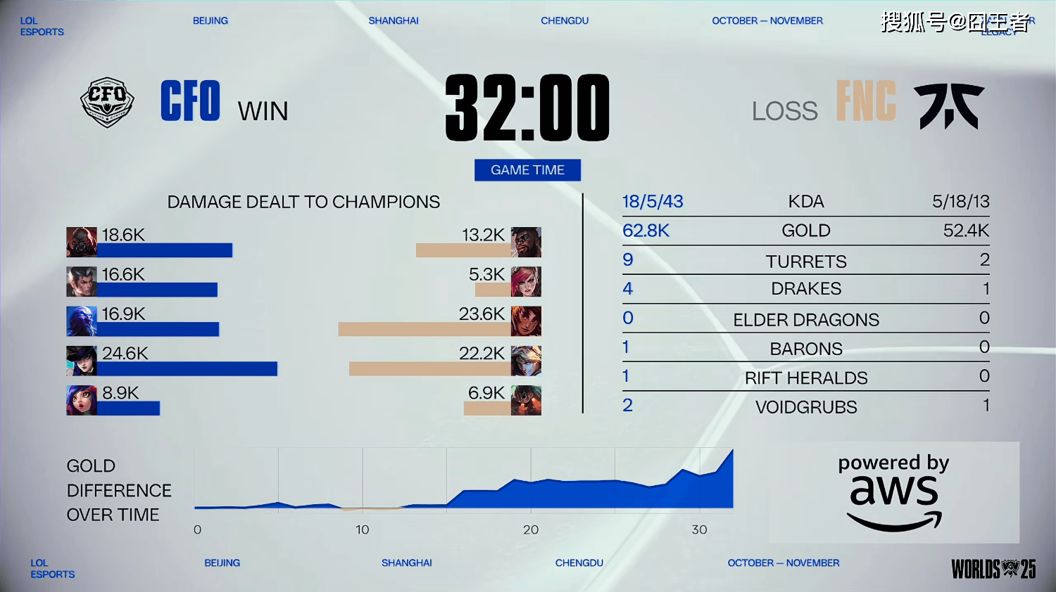 结果这一局比赛,双方也是前15分钟,打得比较激烈,经济咬得比较死,进入下半场后,CFO逐渐占据主动,赢下比赛。5分钟左右:双方上下半区激烈碰撞,Driver赛恩草丛满Q成功完成对位单杀;15分钟左右:妮蔻果断开团配合赛恩进场,CFO打出0换3拿下先锋推掉中一塔;18分钟左右:FNC双TP绕后失败,CFO再次击杀多人控下小龙奠定较大优势;22分钟左右:双方持续拉扯,CFO凭借优势卡住位置最终拿下厄塔汗;28分钟左右:CFO利用女警夹子卡住位置,成功控下大龙追击击杀多人;最终32分钟整:CFO推进成功连续击杀多人,随后顺利一波结束比赛