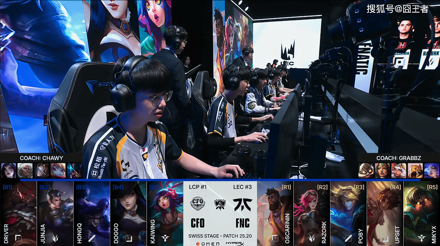 第一局比赛,CFO蓝色方,禁用:卡莎、安蓓萨、发条、波比、挖掘机,选用:Driver赛恩、JunJia赵信、HongQ瑞兹、Doggo女警、Kaiwing妮蔻;FNC红色方,禁用:芸阿娜、沙皇、琪亚娜、希维尔、飞机,选用:Oscarinin奎桑提、Razork蔚、Poby岩雀、Upset伊泽瑞尔、Mikyx泰坦