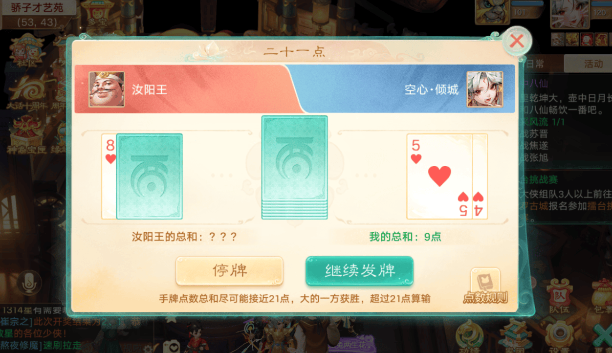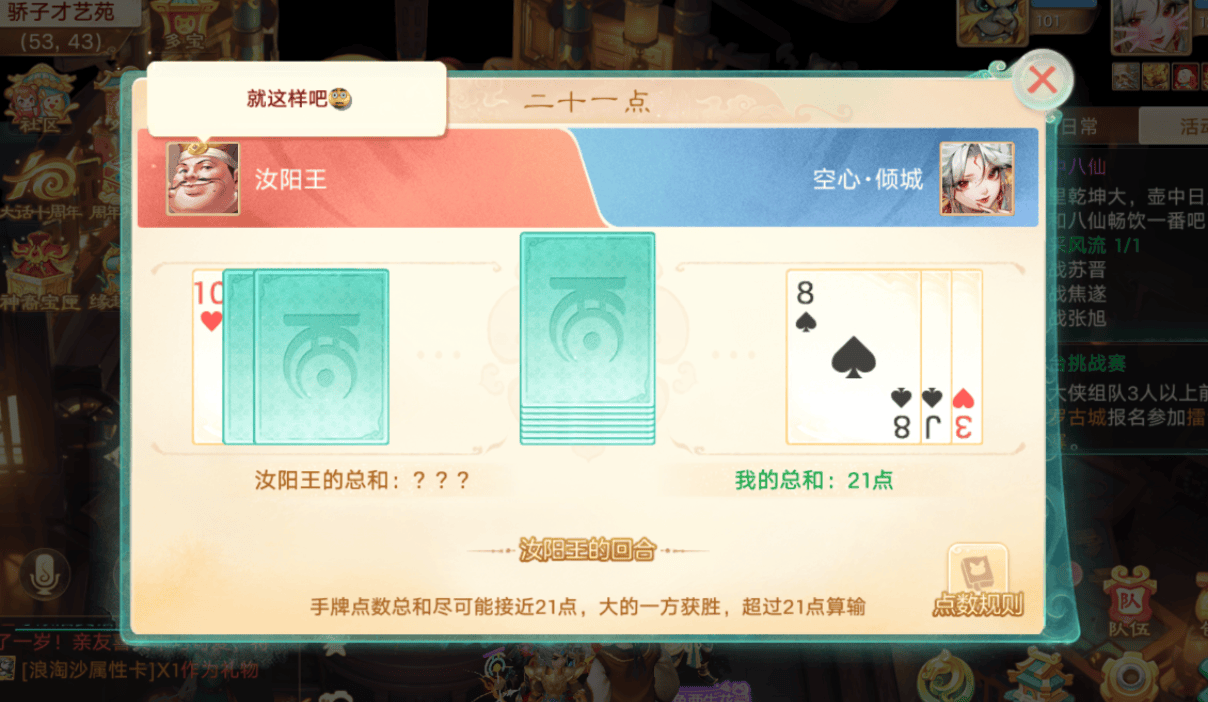 ③汝阳王:21点,这个就比较耳熟能详了,与汝阳王比拼21点游戏,先发两张牌看点,如果自己总数将超过21点,可选择停止发牌,点数大的一方获胜,超过21点算输。