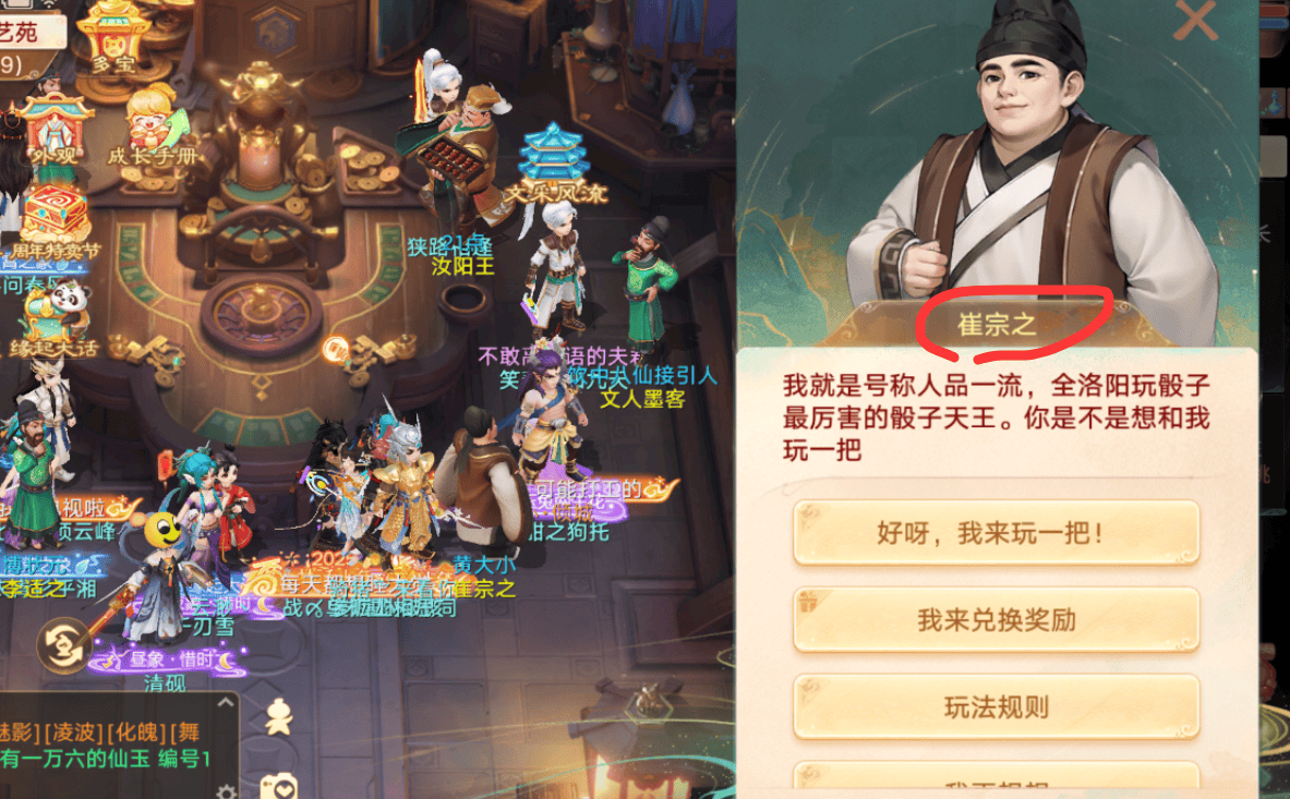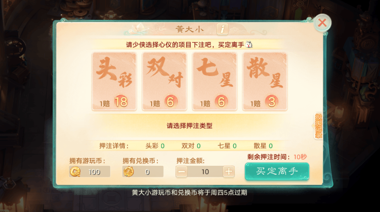 ②崔宗之:黄大小,黄大小进行押注,分为头彩、双对、七星、散星四种,比大小买定离手,可使用黄大小兑换币兑换奖励。