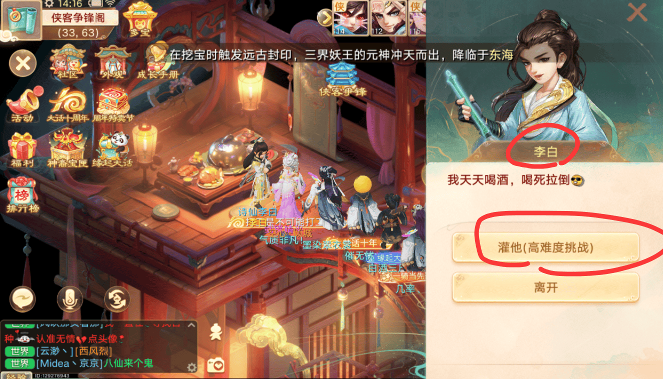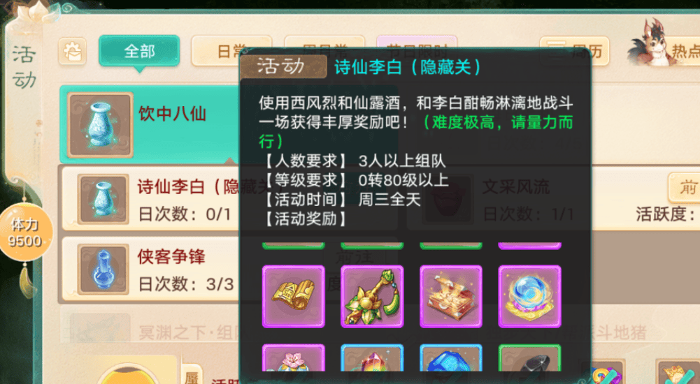 ①李适之:博状元,遵循厦门博状元规则,需要与李适之进行骰子游戏,每一次投掷骰子可获得1W经验(143级以上获得5000)及随机"仙露酒"奖励;