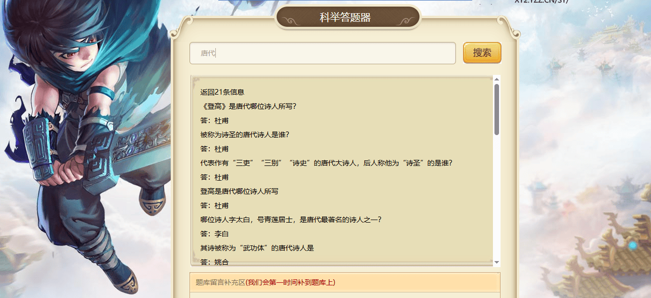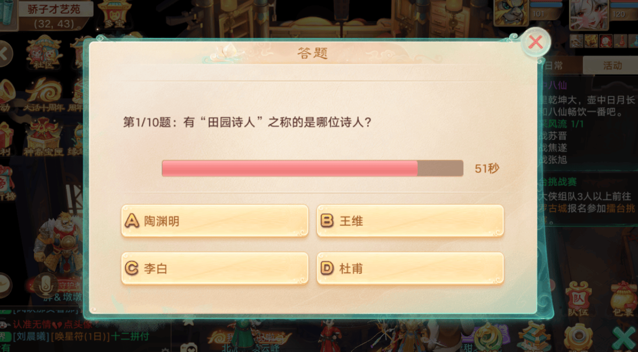 ④贺知章:答题问答,若能答对10道题奖励丰厚,题目看起来考察的都是唐代相关的一些知识问答,大家可使用叶子猪大话手游答题器,准确率可以达到90%以上。