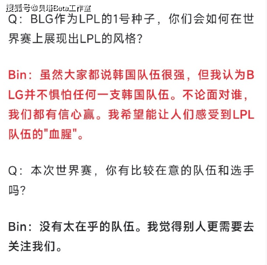 值得一提的是赛前采访的时候,BLG上单bin又是放话:不惧怕任何一支韩国队伍,面对任何队伍都有信心获胜,也没有在意的队伍,反而是其他队伍需要关注BLG!