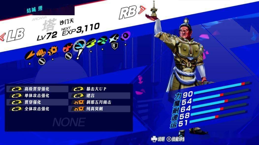 在人格面具的技能上,《P3R》也出现了一些小小的不同:它新增了一部分与交接系统相关的被动技能,可以让你在交接后提高攻击力,或是回复人物的SP等。可以看出,《P3R》试图将5代中通过飞镖之类活动提升的换手增益,转嫁到人格面具系统上,但令人遗憾的是,你只有在合成主角的人格面具时,才能选择是否继承这些技能,而同伴们则统统无法学习。