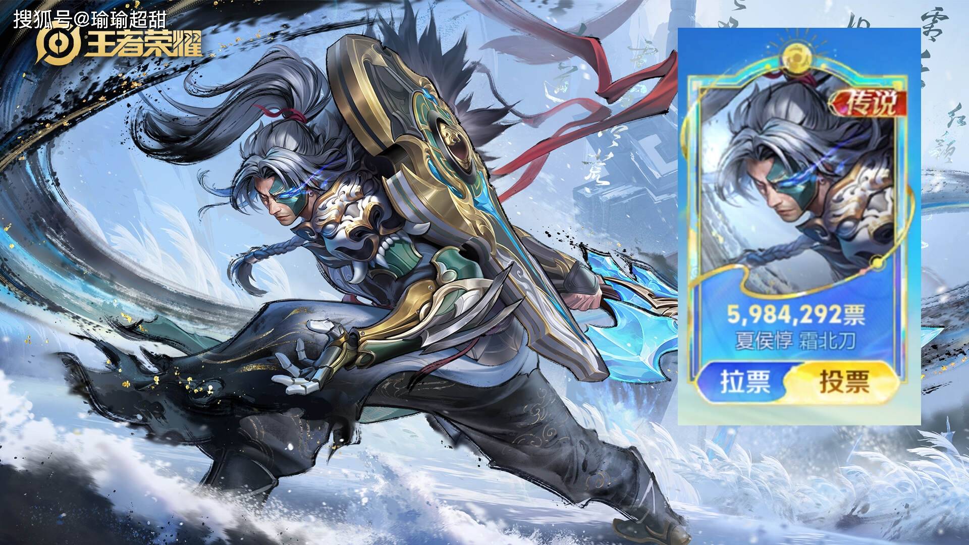 目前第1名的是夏侯惇霜北刀,这款皮肤以598万的票数遥遥领先,排在了第1名。