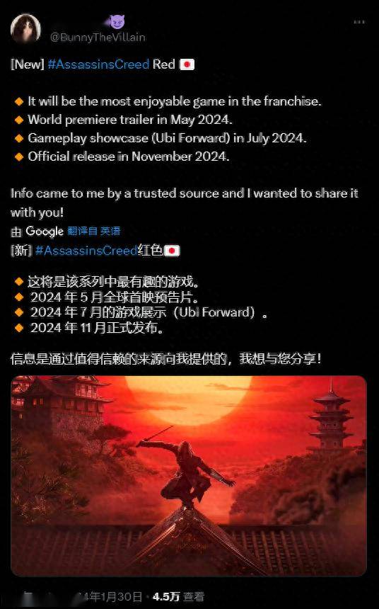 育碧内容创作者 bunny (BunnyTheVillain) 今日爆料了《刺客信条 Red》的发布路线图,称本作将于5月正式公布,7月在育碧发布会上进行实机演示,11月正式发售。