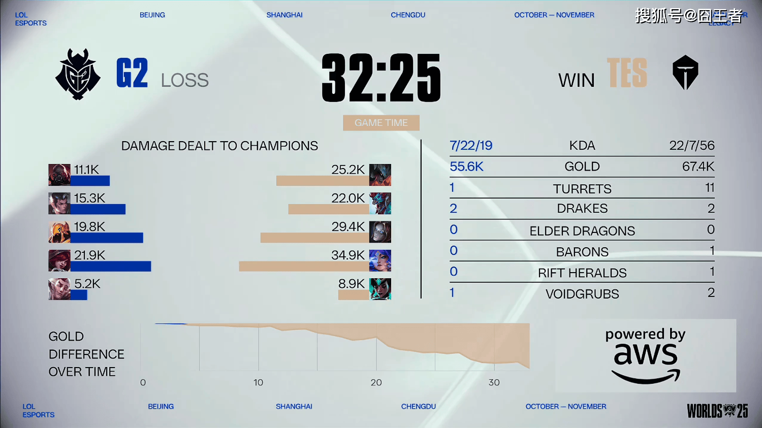 结果这一场比赛,被TES打成了单方面的碾压局,369的剑魔直接上演回廊拉车,G2又被砍杀。3分钟左右,Kanavi特朗德尔支援下路,JackeyLove芸阿娜配合队友击败赛恩,拿下一血;14分钟左右,G2先手击败奥莉安娜,但TES及时支援,Kanavi特朗德尔拿下双杀,TES完成二换四;20分钟左右,369亚托克斯灵活走位吸引火力,JackeyLove芸阿娜抓住机会斩下三杀,TES完成零换五;最终32分25秒,TES稳步推进击败G2三人,随后顺势推平基地拿下比赛