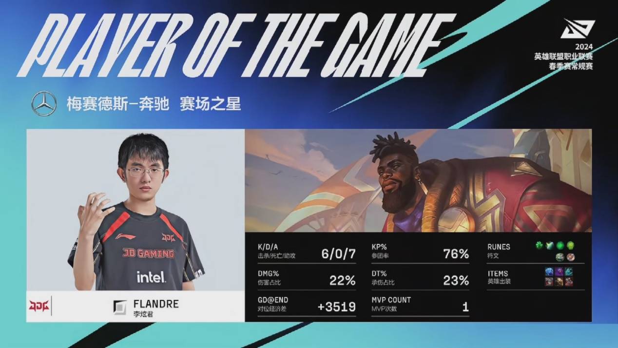 这局比赛双方打得也是异常焦灼,圣枪哥多次团战立功的表现是JDG战队取胜的关键,最终也是拿下了MVP。
