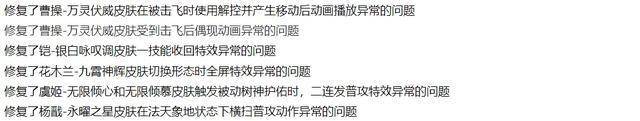 最后则是5款皮肤的Bug修复,曹操的万灵伏威被击飞会变成“轮椅”的问题,也终于要被解决了。对此,你是怎么想的呢?欢迎评论。
