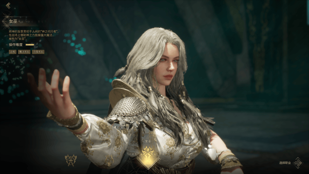 我最喜欢的是女巫造型,银灰色的长卷发,金色花纹的白色战袍,烈焰红唇,冷冽眼神,肤白貌美大长腿。服装既有北欧神话风格的华丽纹饰,又融入了韩游中常见的精致时装设计,战斗动作飒爽利落,配合上魔法特效和处变不惊的御姐音,设计上不用特意媚男也依然眩人耳目,非常有高级感,也非常符合亚洲玩家审美。