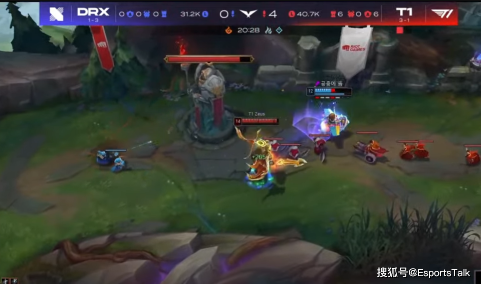 首局DRX真的是非常美妙的开局,下路打出Gumayusi一血,上路打出zeus闪现后续gank将其击杀,中路夹击也击杀了一波Faker,3-0看起来形势大好,但因为T1在前期拿下了两条小龙,所以在听牌龙的团战中,DRX必须来靠,结果这一靠,被T1打出了一波0换3,T1成功吃掉刚刷新的大龙,但小龙也被DRX斩断。