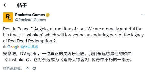 Rockstar在社交媒体上发文悼念这位音乐人:“安息吧,D’Angelo,真正的灵魂巨匠。我们永远感激他为《荒野大镖客2》带来的歌曲《Unshaken》,它将永远成为这部作品遗产的一部分。”