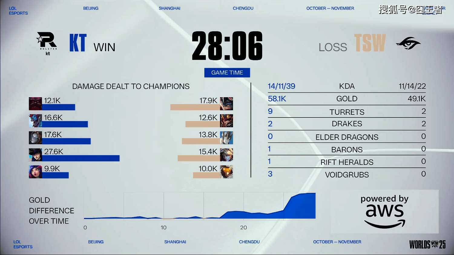 结果这一局比赛,前十几分钟,两队打得比较激烈,经济咬得比较紧,后期就被KT无限拉开差距,最终KT赢下比赛。7分钟左右:加里奥大招快速支援,配合Hizto皇子击杀巨魔成功拿下一血;11分钟左右:KT中上持续换经济,但TSW多人集结下路拿下战斗先机;17分钟左右:KT成功打出0换2,并成功控下先锋扳回劣势;21分钟左右:双方河道爆发混战,互有操作完成多人互换;25分钟左右:妮蔻抢下小龙,KT果断追击击溃对手打出0换4;最终28分06秒,KT团灭TSW,赢下比赛。