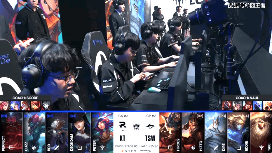 第一局比赛,KT蓝色方,禁用:蔚、芸阿娜、阿萝拉、安妮、烬,选用:PerfecT奥恩、Cuzz巨魔、Bdd发条、Deokdam女警、Peter妮蔻;TSW红色方,禁用:沙皇、瑞兹、猴子、赵信、赛恩,选用:Hiro02兰博、Hizto皇子、Dire加里奥、Eddie伊泽瑞尔、Taki巴德