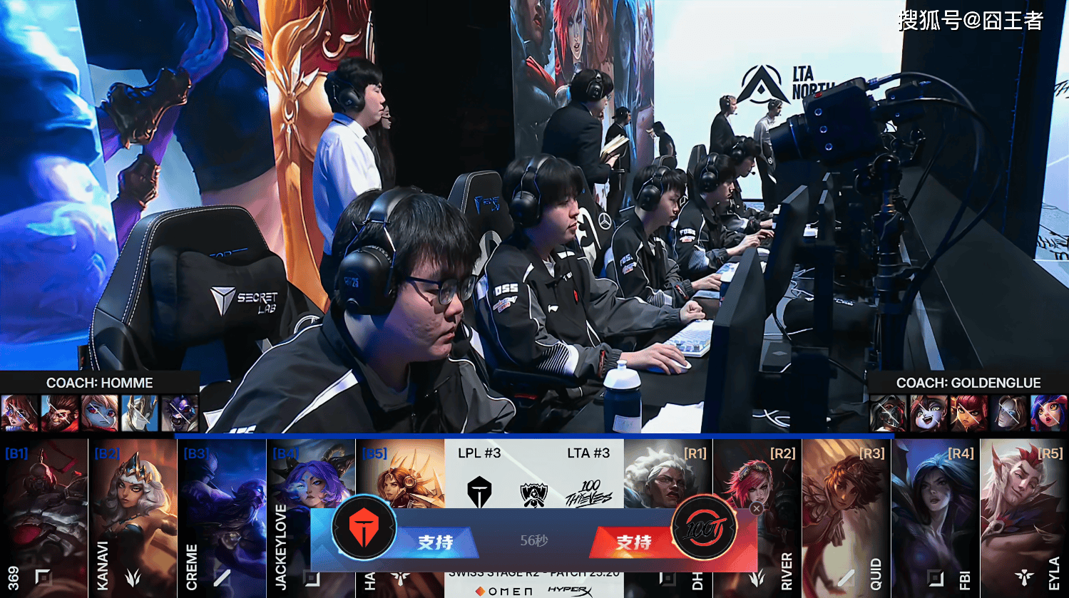 第一局比赛,TES蓝色方,禁用:阿萝拉、猴子、波比、加里奥、牛头,选用:369塞恩、Kanavi奇亚娜、Creme瑞兹、JackeyLove芸阿娜、Hang蕾欧娜;100T红色方,禁用:烈娜塔、璐璐、安妮、发条、妮蔻,选用:Dhokla安蓓萨、River蔚、Quid岩雀、Eyla洛