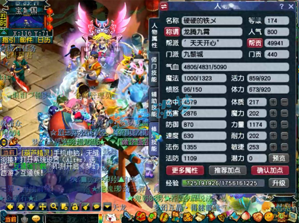 号是174级的九黎城,仅差一级就满级了,不过这一级需要很多经验!