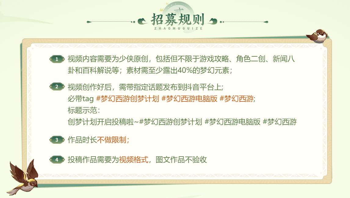 少侠发布的视频内容需为原创,包括但不限于游戏攻略、角色二创、新闻八卦和百科解说等,少侠可以尽情发挥自己的创造力。素材需露出至少40%的梦幻元素,视频时长要求从15s以上变更为没有任何限制,让你的才华在三界中闪耀吧!投稿零门槛,上手超轻松,在真正意义上做到动动手指就能把现金奖励带走。
