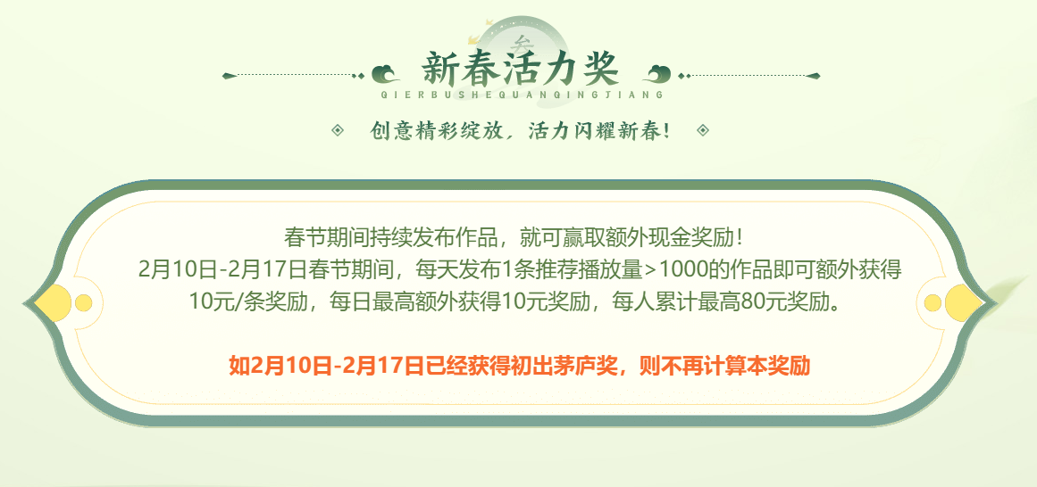 针对在春节期间坚持发布作品的达人,造梦计划推出了“新春活力”奖。2月10日-2月17日春节期间,每天发布1条推荐播放量>1000的作品,即可额外获得10元/条奖励,每日最高额外获得10元奖励,每人累计最高80元奖励。如2月10日-2月17日已经获得“初出茅庐”奖,则不再计算本奖励。