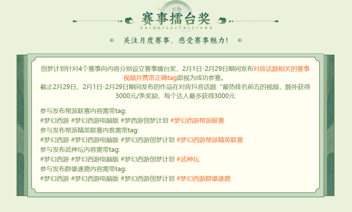 针对赛事向内容,创梦计划设立了包含四个赛道的“赛事擂台”奖,2月1日-2月29日期间,发布对应话题相关的赛事视频并携带正确tag即视为成功参赛。除#梦幻西游 #梦幻西游电脑版 #梦幻西游创梦计划3个必带tag外,参与发布帮派联赛内容、帮派精英联赛内容、武神坛内容、群雄逐鹿内容需带对应tag#梦幻西游帮派联赛、#梦幻西游帮派精英联赛、#武神坛、#梦幻西游群雄逐鹿。截止2月29日,2月1日-2月29日期间发布的作品在对应抖音话题“最热”排名前五的视频,额外获得3000元/条奖励,每个达人最多获得3000元。