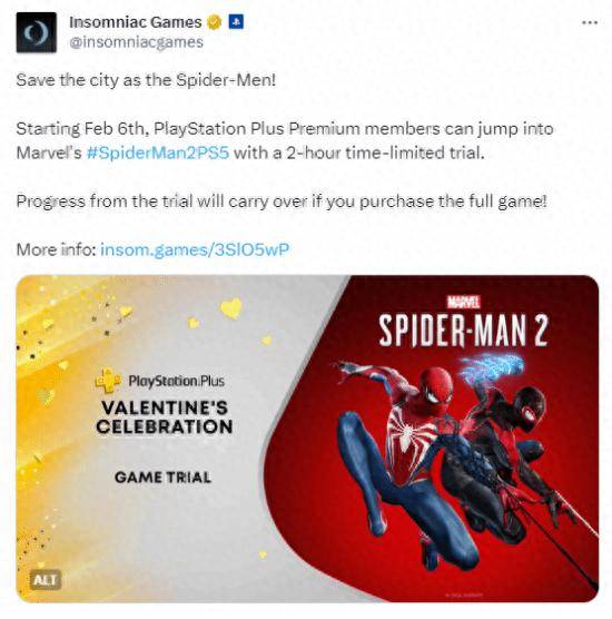 失眠组宣布,《漫威蜘蛛侠2》将于2月6日起加入PS+三档试玩,购买该服务的会员可以试玩两个小时。此外,试玩的进度将会继承进正式版游戏。