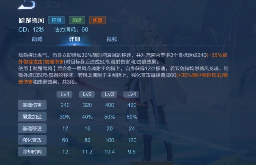 三技能跟前两个技能一样是挥出剑气,但是能够立即获得移速加成,还能够带来击退的效果。风龙魂叠加以后,自身的移动速度将会变得更快。除了这三个技能以外,就是他的大招,开启之后敖隐直接飞天,长达4.5秒的时间不能够被选中,上官婉儿看了都要流泪,这些可以自己提前选择结束。在天上的过程中敖隐会向前俯冲,对路径上敌人造成减速和伤害,并且在落地点带来眩晕,控制敌人。