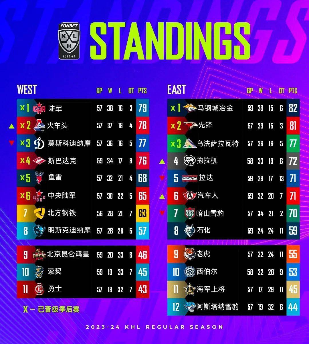昨晚莫斯科中央陆军3-2击败下诺夫哥罗德鱼雷,而昆仑鸿星零封勇士帮助卫冕冠军成为第9支锁定2024年KHL加加林杯季后赛席位的队伍。