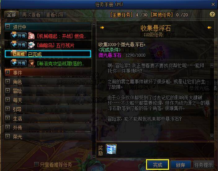 获得1000个微光悬浮石后,就可以去领取外传任务【收集悬浮石】了。