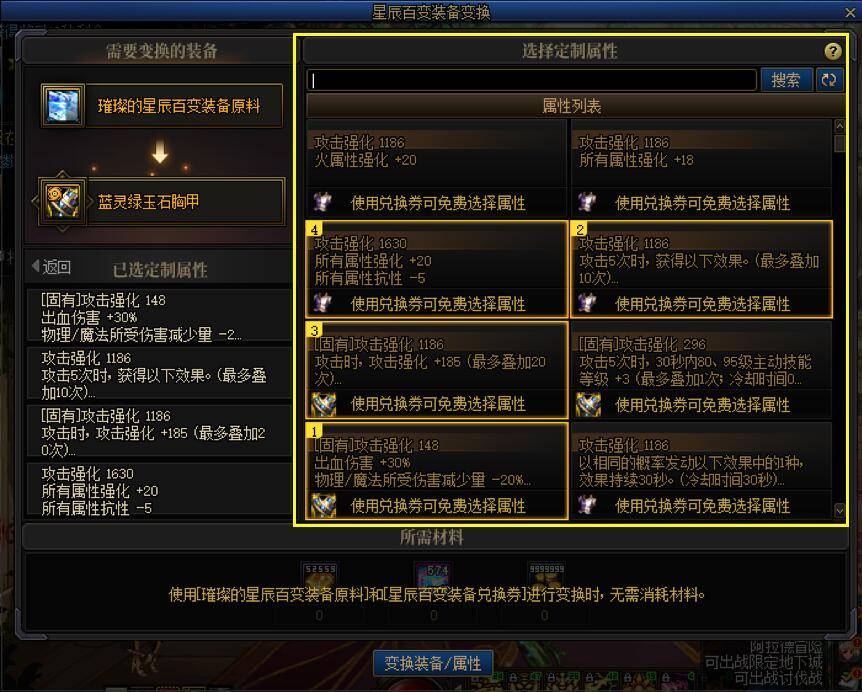 随后再在右侧属性列表中选择需要的词条,最后点击下方的【变换装备/属性】即可得到大百变装备。
