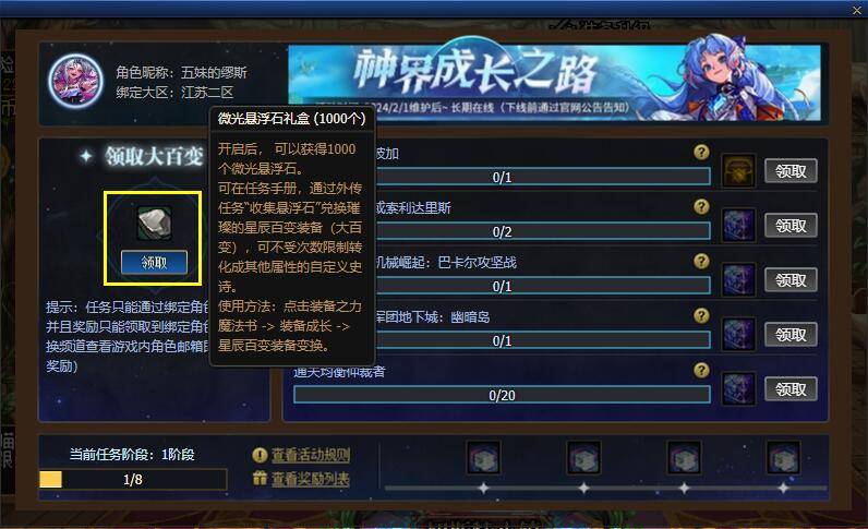 2月1日上线的新活动【神界成长之路】中,绑定即可领取1000个微光悬浮石,来完成大百变的任务,那么活动具体如何参与,大百变应该如何选择呢?想要了解的小伙伴就跟随笔者一起来看看吧!