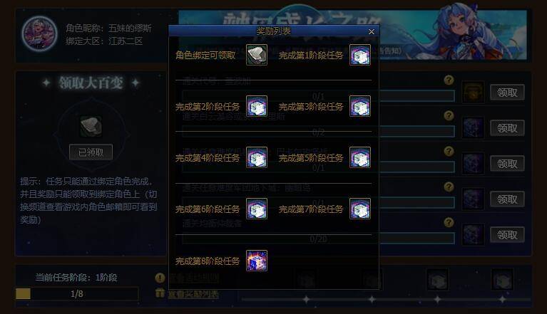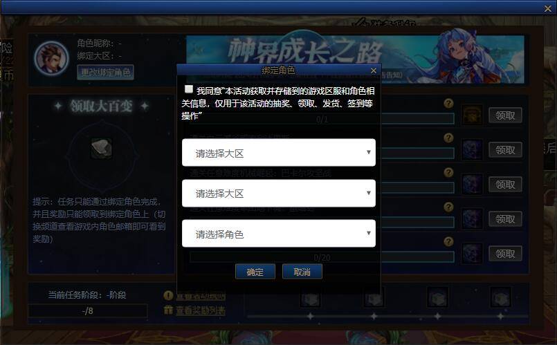 第一次打开活动页面时需要绑定活动角色,绑定时会要求输入【确定绑定该角色】再次进行确认。需注意活动发放的道具类型均为无法交易,没办法转移给其他角色,绑定角色前一定要考虑清楚。