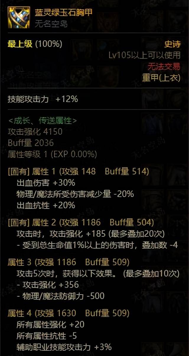 在满足攻速要求后,就可以开始以强度进行排序了,例如出血散搭流的毕业上衣蓝灵绿玉石胸甲与固定属性史诗相比,高出11.2%的伤害,而毕业项链森林之魔女项链与固定属性史诗相比,仅高出1.7%的伤害,显而易见应该将大百变优先变换蓝灵绿玉石胸甲。