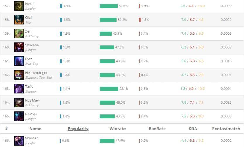 这个是数据网站leagueofgraphs的统计,公布出来后大家可以看到,蝎子继续排名第一名,成为登场路最低的英雄,也是唯一一位上场率不足1%的英雄,只有可怜的0.6%,也不知道新赛季设计师能不能重做他。