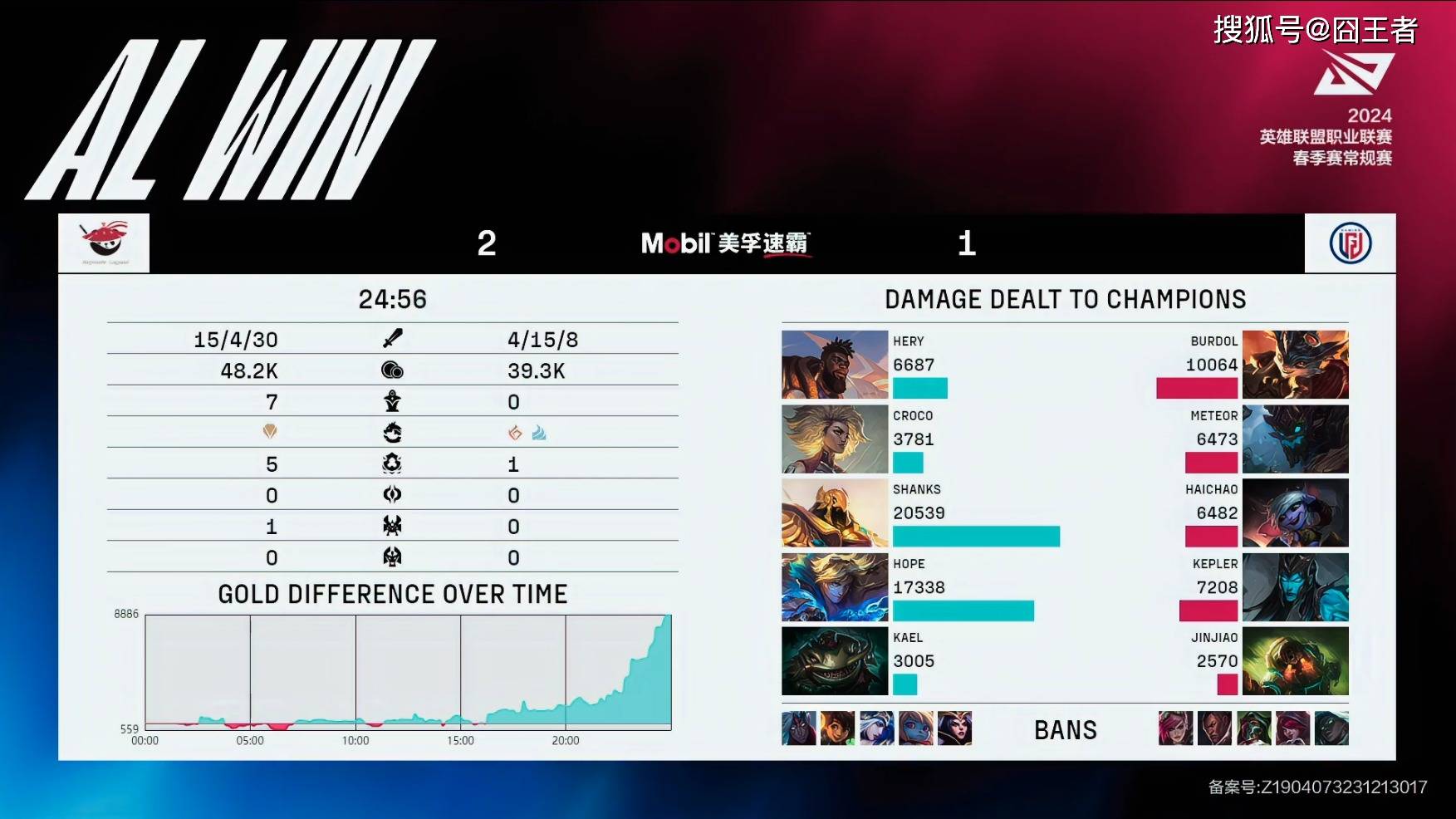结果第三局比赛,两队在前20分钟内,打得比较谨慎,多数时间都在运营,交手不多。转折点发生在22分钟左右,AL在先击杀小炮的情况下,利用大龙逼团,随后连续击杀LGD3人后斩获大龙。随后24分56秒,AL携大龙Buff推进,LGD众将忙中出错,站位出错,被AL抓住机会直接开团,伊泽瑞尔拿下四杀后,AL轻松赢下比赛!