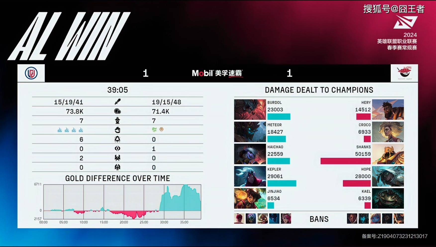结果真的是怕什么,就来什么。两队第一局比赛,还真就被打成了“LCK式的运营局”。差不多40分钟的比赛中,两队在前中期交战不多,甚至甚至可以说是互相不搭理,就连击杀和小龙数都持平。转折点发生在30分钟左右,LGD忍不住Rush大龙成功,随后还并击败了赶来接团的AL。携大龙Buff突进的LGD,开始滚起了雪球,最终39分39秒,LGD再拿大龙推掉三路后,成功赢下第一局比赛。