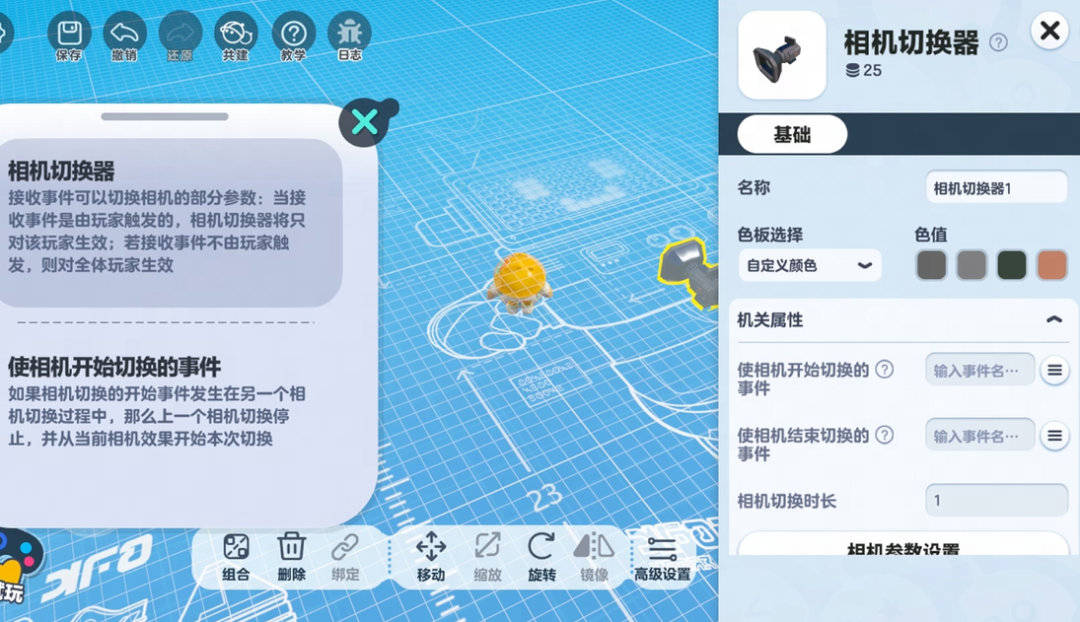 新增的“相机切换器”组件可以帮助蛋仔们实现更丝滑的转场,制作的地图会变得更加精美。相机参数设置则添加了“第三人称视角”、“横版锁视角”、“斜45度锁视角”参数模版,想用什么就用什么,制作更自由,使用更舒心。