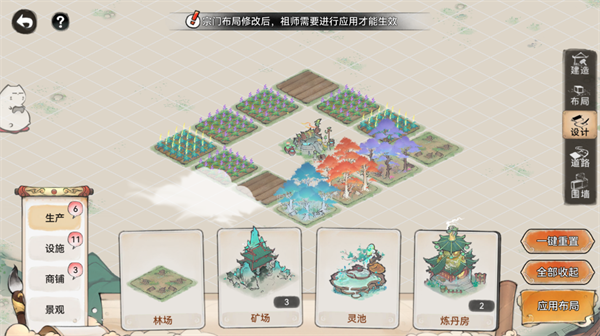 在宗门内点建造可以开启建造模式,进行建筑摆放布局,布置好之后点应用布局就保存了。