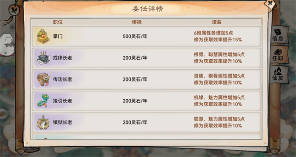 宗门大殿可以委任弟子职位,可以得到相对应的效果。