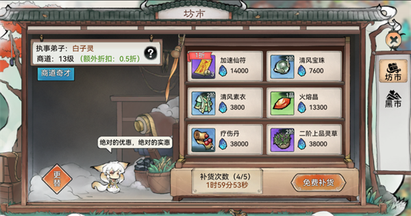 宗门等级10级的时候会解锁坊市,可以在里面购买一些物品,坊市每天可以补货五次,推荐必买加速符、灵草灵木,和法宝炼制用的材料。