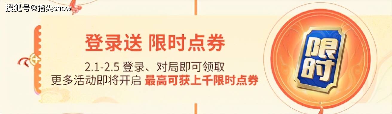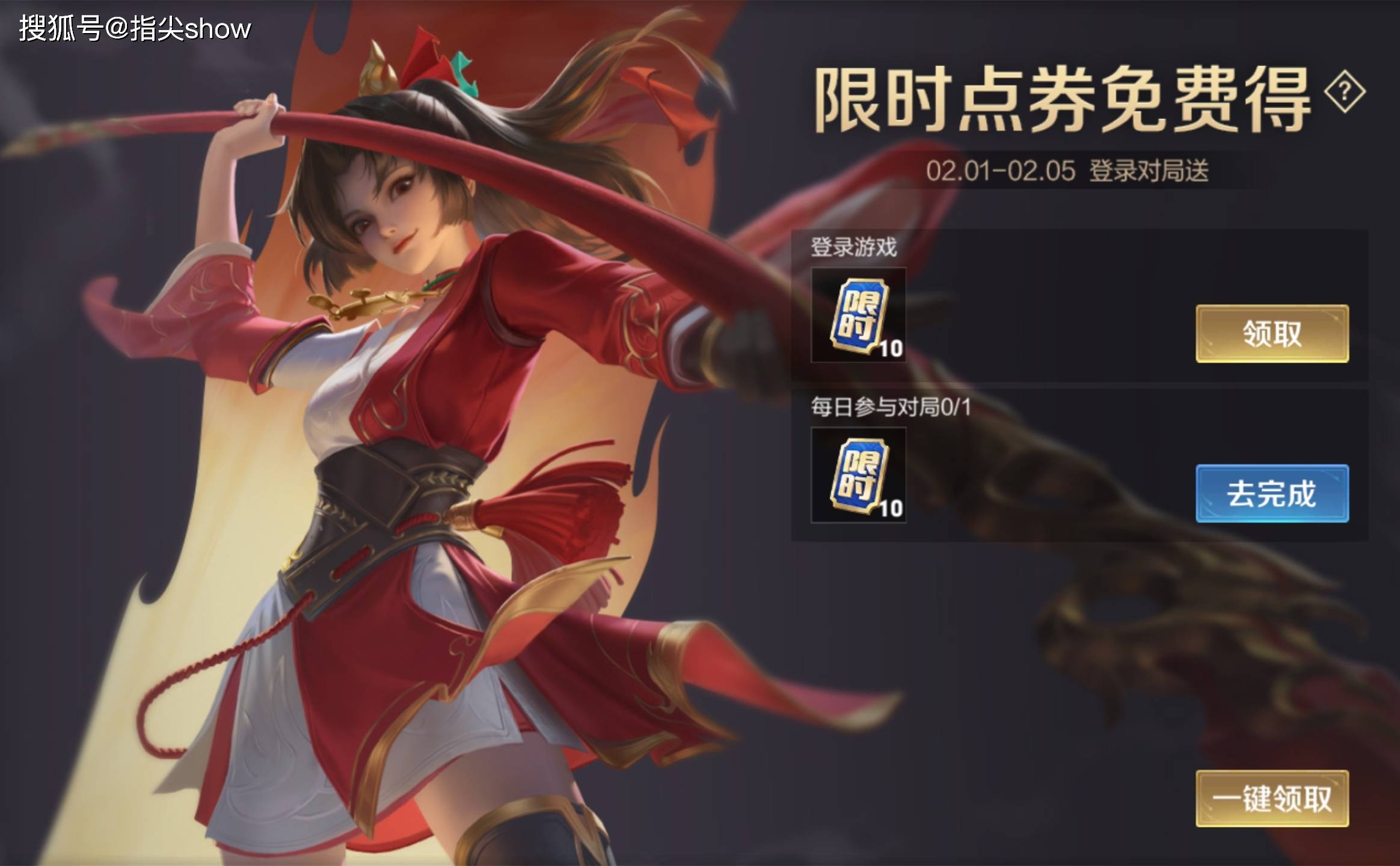 2月1日到2月5日登陆游戏每天可以领取10点券,每日参与一次对局游戏还能获取10点券,最高100点券。