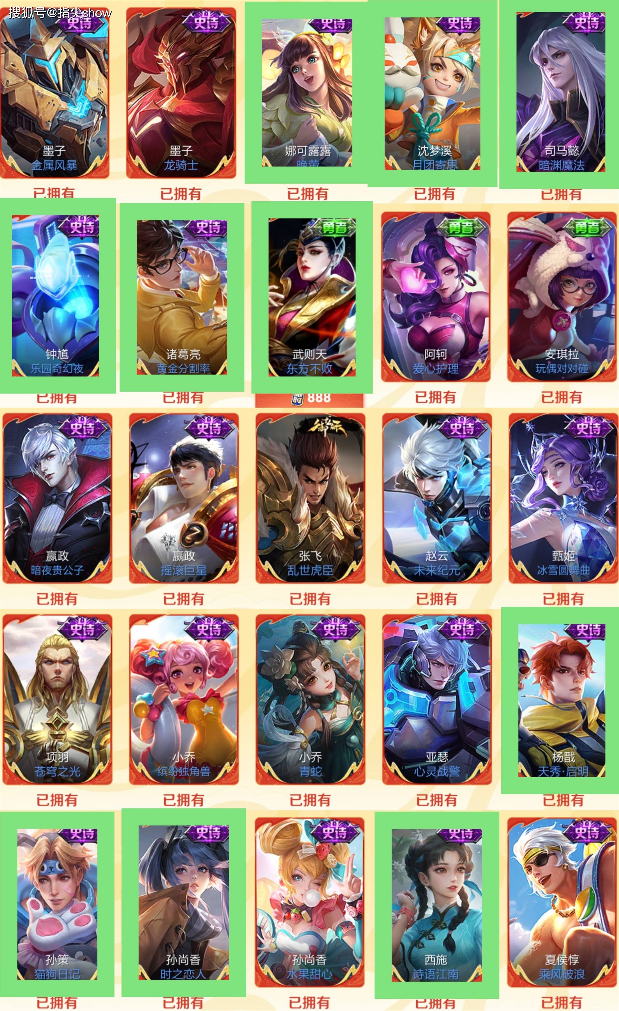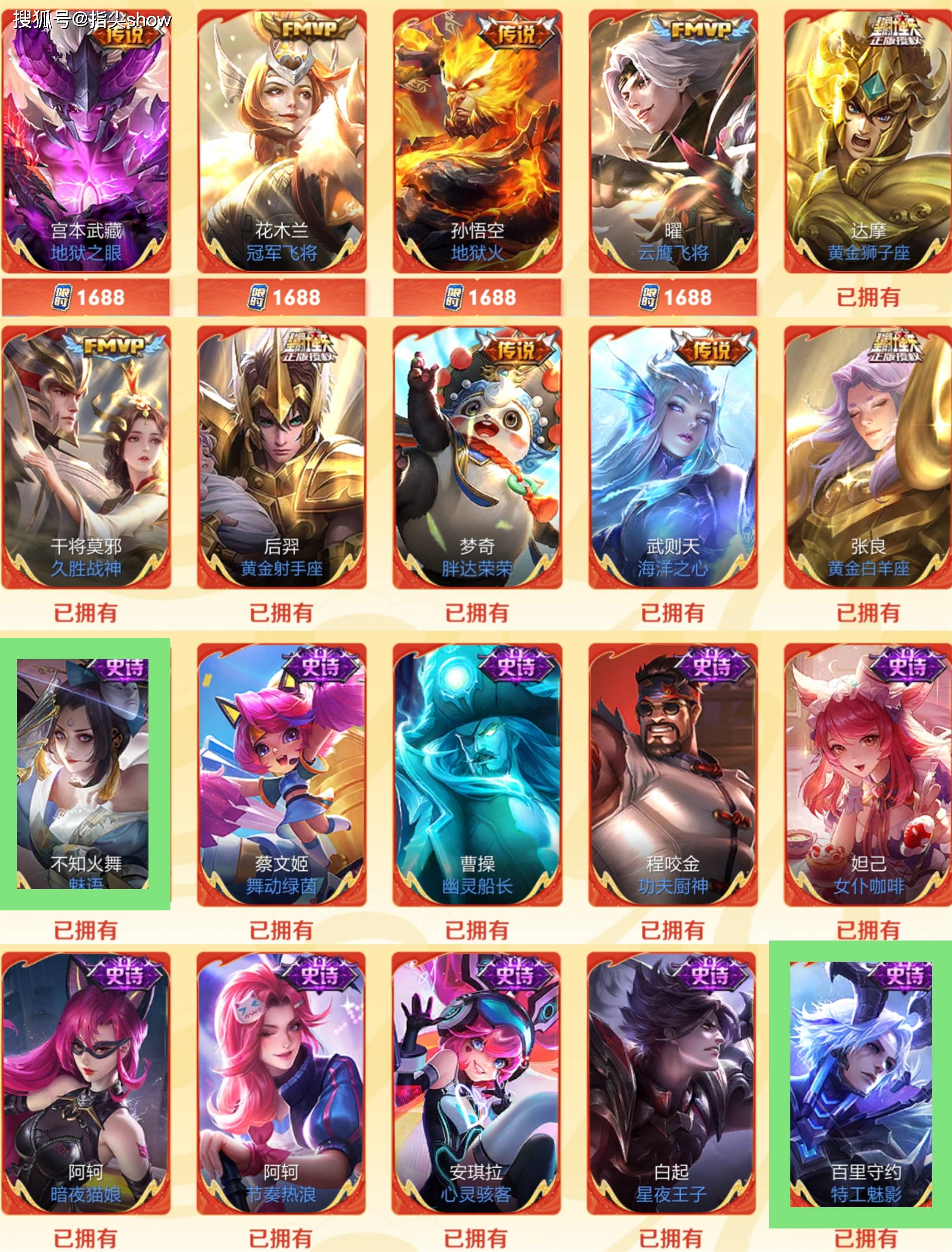 而史诗皮肤中,用绿色套住的即是从未进入过碎片商店的皮肤,可以优先考虑,像SNK的三款皮肤都是上佳之选,没攒齐的,一个都不要错过。