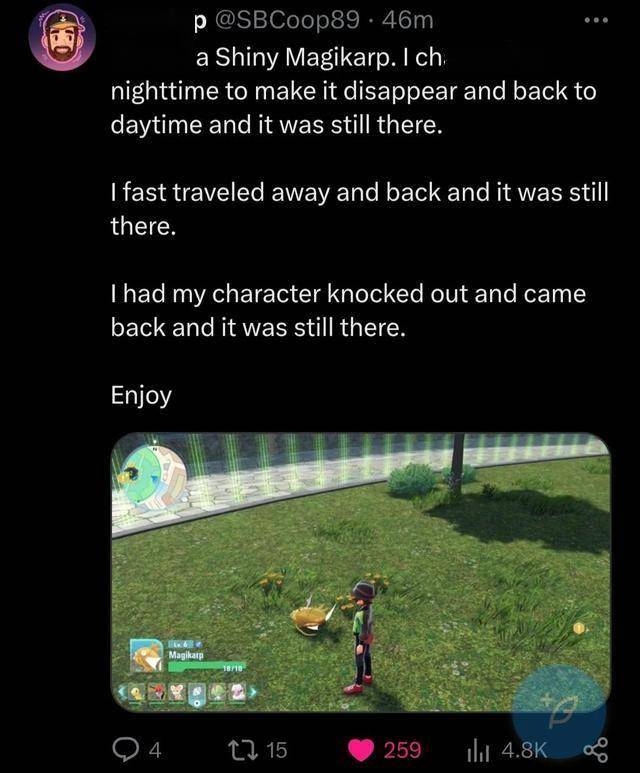 这一机制已获玩家社群广泛验证。Reddit论坛中有玩家发帖称,其在遭遇闪光鲤鱼王后,不仅主动离开场景,还通过调整游戏内时间周期等多种操作进行测试,返回时该闪光个体依然在原处停留。多轮测试表明,时间流逝与地图切换均不会导致闪光宝可梦消失。