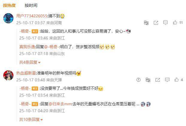 短视频发布后,迅速引发玩家猜测。面对评论区“猜不透”的评论,杨奇回应称:“这回的人和事儿可没那么容易猜了,安心~”。当有玩家询问是否在准备新年视频时,他否认了这一说法,表示今年将改用贺图形式,并调侃道:“去年的无量蝠毛衣还在仓库里压着,没货带了。”