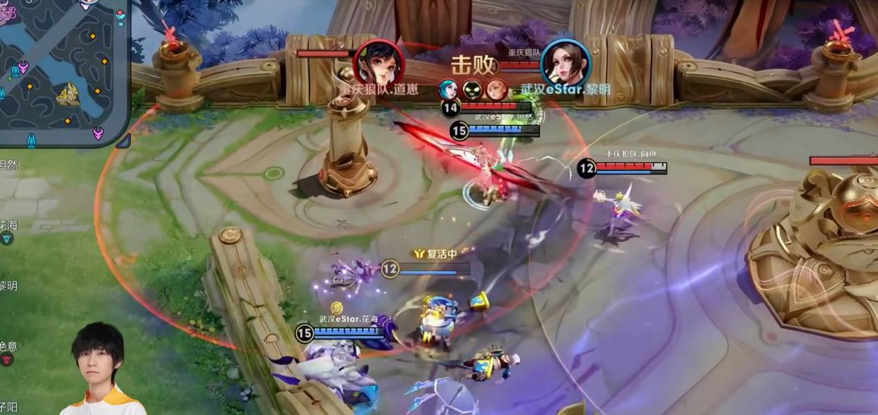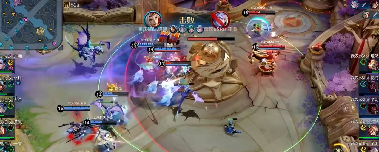 第一局,道崽就向我们展现了他凶猛的打法。前期狼队经济劣势,队内气氛比较压抑,就在这是,道崽抓住敌方射手失误,直接越塔单杀为队伍找回局势。之后在比赛中期,estarPro全员逼中,道崽抓住机会,一闪击杀掉了残血的黎明,为队伍打开局面。之后意识到道崽威胁的estarPro打算集全员之力越塔击杀掉他。