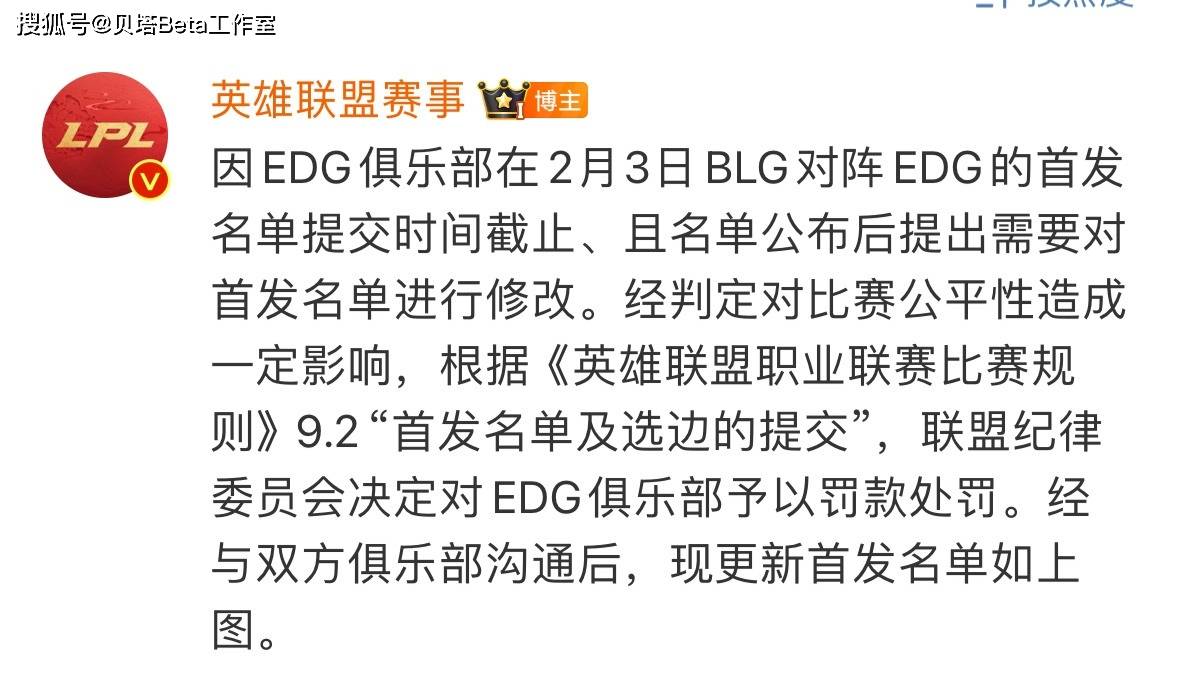 但是没想到凌晨2点的时候,LPL官方突然表示:EDG在首发名单提交时间截止、并且名单公布之后,提出对首发名单进行更改。根据比赛规则,官方决定对EDG罚款处罚,两支俱乐部沟通后,EDG的首发名单将做出更改。